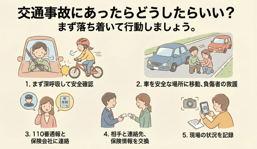 まずは安全確保→警察連絡→医療機関受診→保険・示談手続きという流れを意識して、落ち着いて対応しましょう。